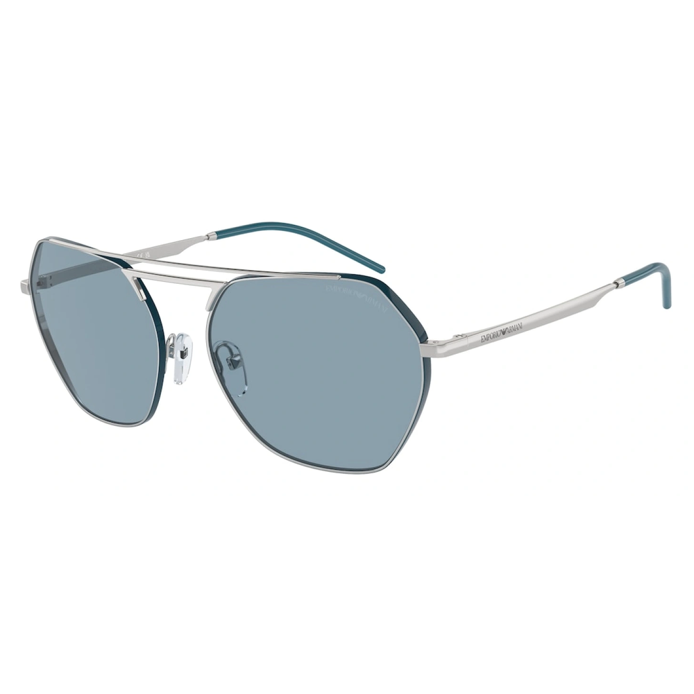 EMPORIO ARMANI EA 2148 3015/80 is a Women Sunglasses product by the brand EMPORIO ARMANI. The front color is Shiny Silver, and the temple color is Silver – Blue. The lens color is Light Blue, and it has a lens diameter of 56mm, a bridge width of 16mm, and temple length of 140mm. This Sunglasses is made from Metal material.