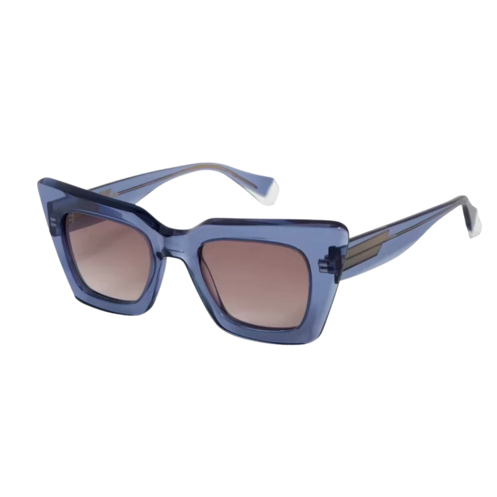 GIGISTUDIOS 6709/3 SCARLETT S/L is a Women Sunglass product by the brand GIGI. The front color is BLUE, TRANSPARENT, and the temple color is BLUE, Transparent. The lens color is Brown Lenses, and it has a lens diameter of 48mm, a bridge width of 22mm, and temple length of 145mm. This Sunglass is made from High Quality Acetate material.