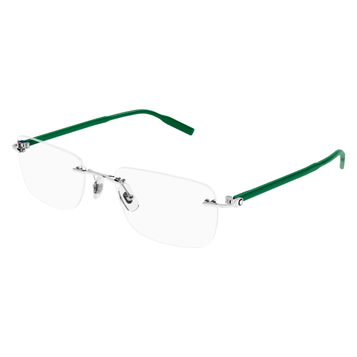MB0221O-004 is a Men Optical Frame product by the brand MONT BLANC. The front color is Silver, and the temple color is GREEN. The lens color is TRANSPARENT, and it has a lens diameter of 57mm, a bridge width of 20mm, and temple length of 145mm. This Optical Frame is made from FRONT MAIN METAL, LENS DEMO LENS, TEMPLE MAIN INJECTION material.